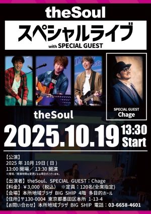 10月19日(日)、本所地域プラザ BIG SHIP 4階多目的ホールにて開催される theSoulスペシャルライブ にChage のゲスト出演が決定しました!